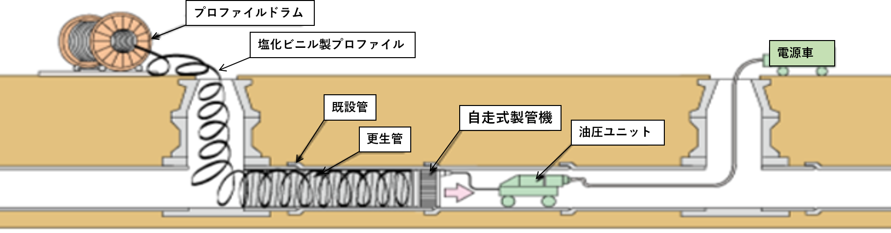 既設の下水道管内面に塩化ビニル製プロファイルをらせん状に巻き立て、下水道管を更生する工法です。道路を掘らずに下水を流しながら施工が可能で、円形管、馬蹄形渠、矩形渠等様々な断面形状に対応できます。