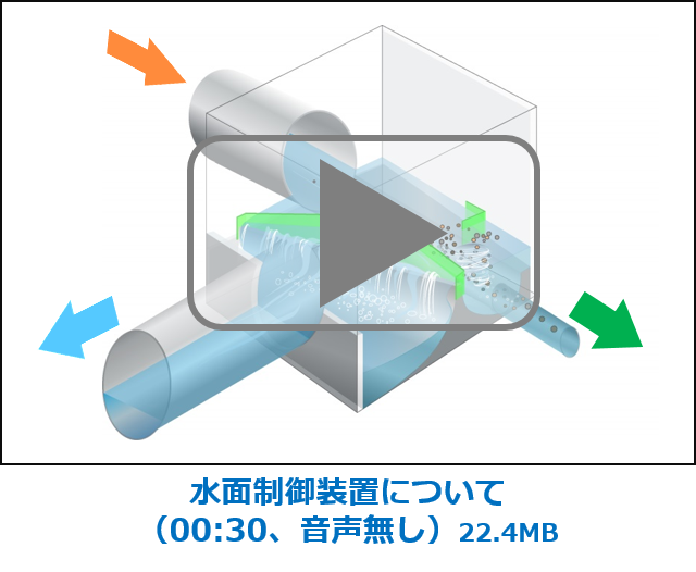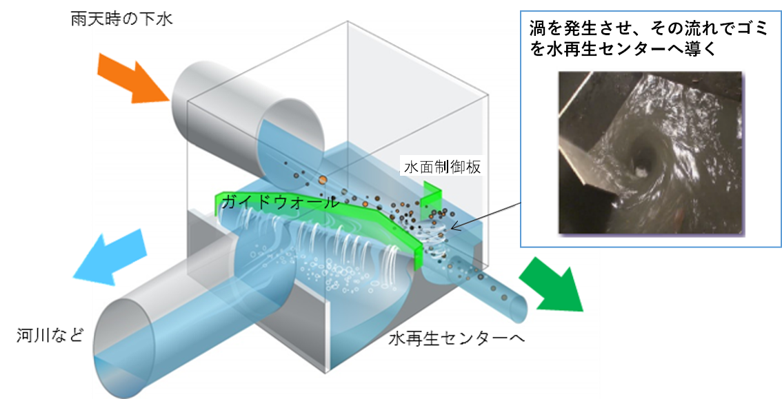 雨天時に合流式下水道から河川などに流出するごみを7割以上除去することができる装置です。雨水吐室の汚水が流出する管の入口に、水面制御板を設置するとともに、越流堰の前面にガイドウォールを設置し、渦巻き流を誘発させ、ごみ等を下流側に流出する管へ導きます。動力を必要とせず構造が単純なので、設置や維持管理が容易で低コストです。