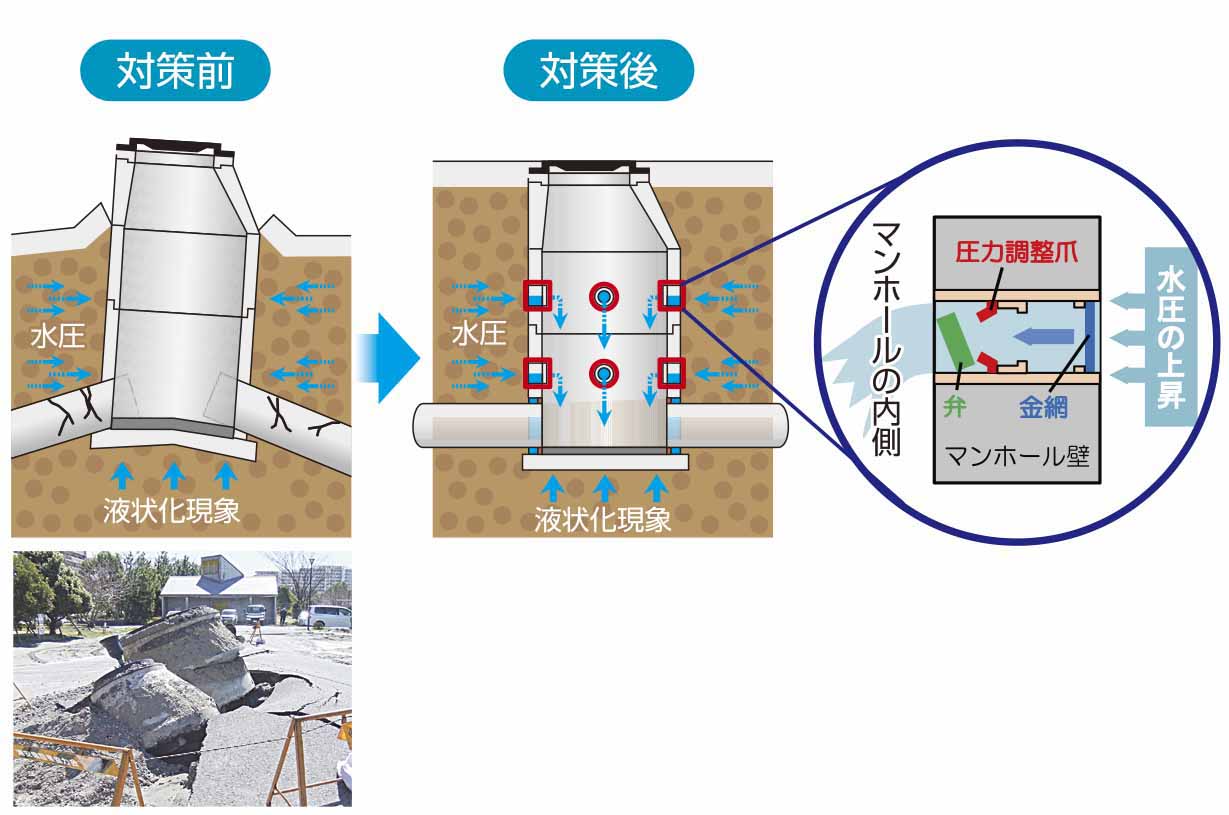 液状化現象による過剰な水圧をマンホール内に逃がして浮上を抑制し、下水の流下機能を確保します。この工法では、マンホール内に弁を設置します。地震発生時に地下水圧が上昇すると、自動的に弁が外れて、マンホールの内部に地下水を取り込みます。道路を掘らずマンホールの内側からスピーディーかつ安価に施工することができます。施工後も下水道の維持管理上の支障になりません。