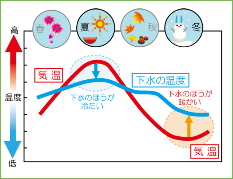 下水は年間を通して温度変化が小さく、外気に比べ夏は冷たく、冬は暖かいといった特徴があります。この外気との温度差を活用し、水再生センターや近隣のビルなどで冷暖房の熱源として利用しています。また、3つの地区で大規模な地域冷暖房事業を行っています。