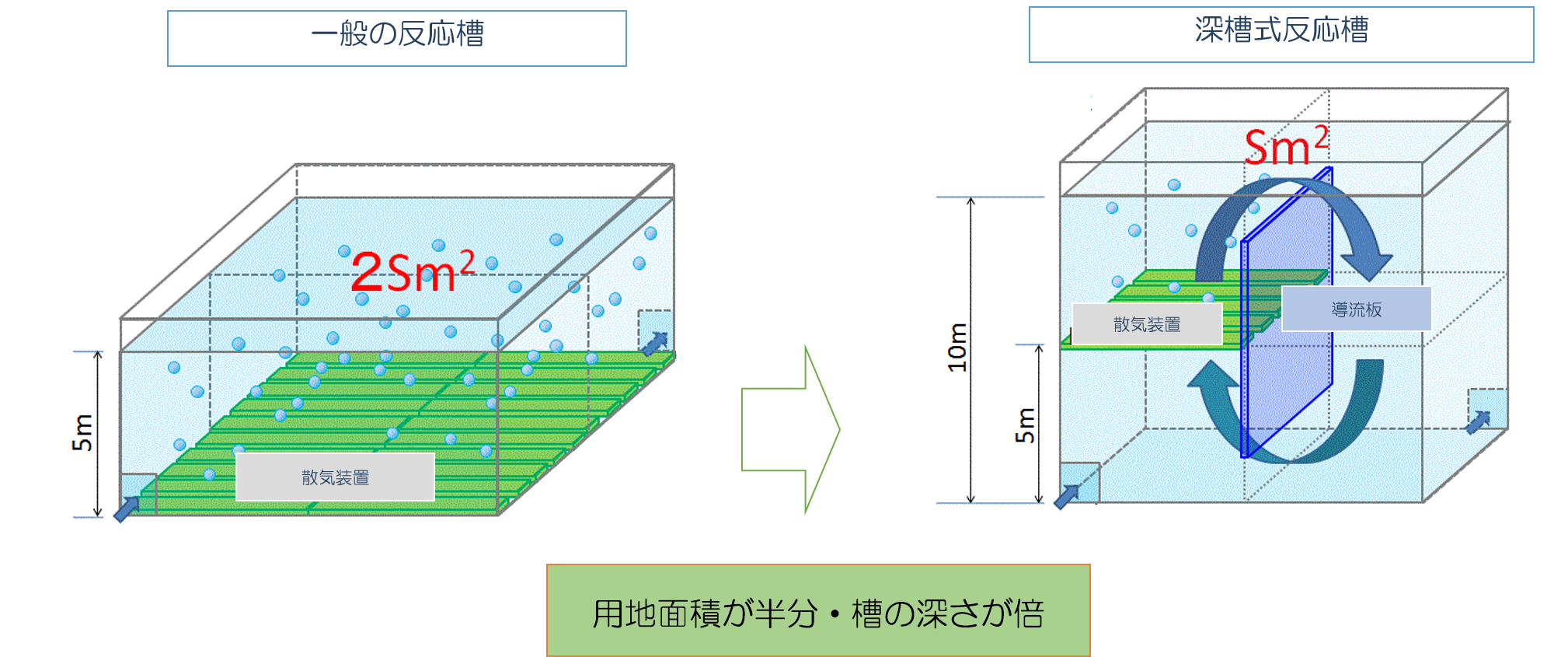 東京のような過密都市においては、処理に必要な大規模用地を確保することが容易ではありません。そこで、一般的な反応槽の倍の深さの深槽式反応槽を用いることにより、狭い処理場用地でも下水処理能力を確保することができます。
