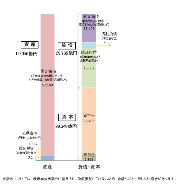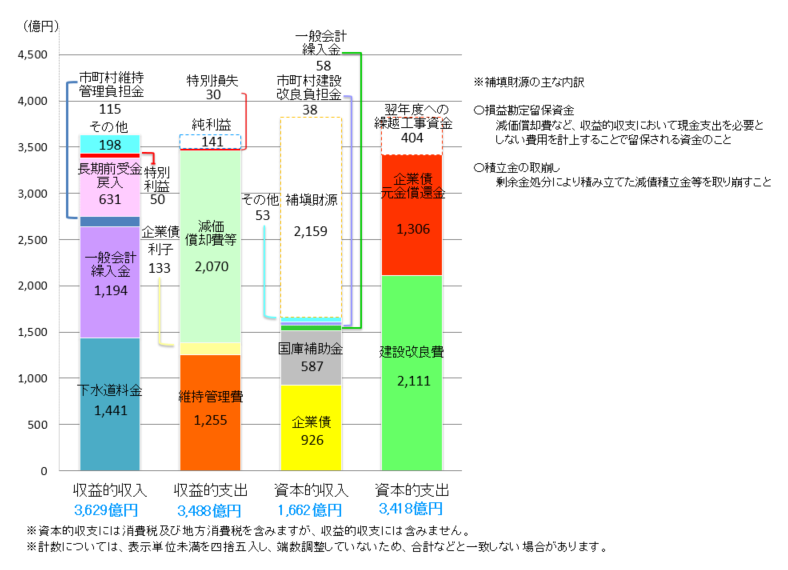 資本的収支とは、主として将来の営業活動に備えて行う下水道施設の建設改良費や企業債の元金償還金等の支出とその財源となる企業債や国庫補助金等の収入を表したものです。
