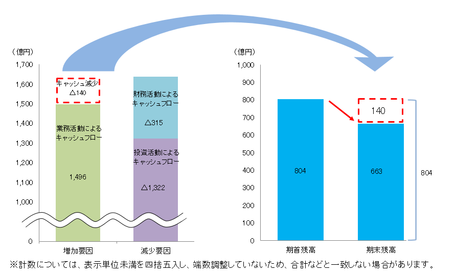 令和3年度は、業務活動で1,496億円増加し、投資活動で1,322億円、財務活動で315億円減少しました。結果として、期首残高804億円から140億円減少し、期末残高663億円となりました。