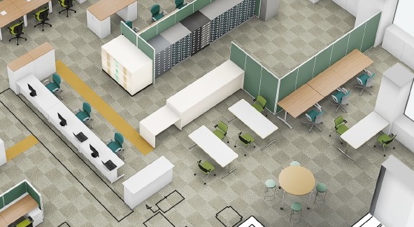 下水道台帳閲覧室は、レイアウト変更後、図面を広げてじっくり調べることができる作業机の設置、短時間で簡単に閲覧するためのハイテーブルの設置等、お客様にとってより使いやすい空間になります。