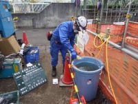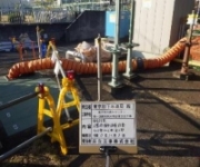 | PRポイント | 導水渠内及び第一沈殿池槽内から漏れる臭気対策として、槽内作業時は消臭剤を噴霧し、槽内に入る仮設昇降設備はシートで覆い、槽内換気の排気は別の槽内に排気して、臭気対策を行った。 |