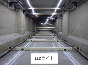 | PRポイント | 沈殿池内での工事の場合、通常、投光器(約0.2kWh/台)を複数台設け照度を確保する必要がある。この方法は、照射した箇所は明るいが影になる部分は非常に暗くなる。本工事で採用したLEDのロープライトは単体光源の輝度は大きくないが、光源が沢山あるため影が出来ずらく全体的に明るい空間を作ることが出来る。LEDのため消費電力も20mで約0.12kWh(40m/1水路)と少なくCO₂削減(約4,500kg-CO₂)に貢献できる。 |
