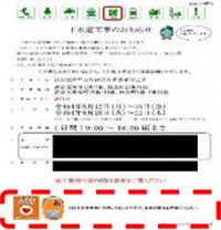 | PRポイント | 地域住民に配布している工事お知らせビラに、現場内に設置したAEDは「いつでも・誰でも」利用できることを記載し、広く周知した。 また、熱中症対策として常備した経口補水液等について、現場に従事する作業員だけでなく、地域住民から求められた場合にも提供することで、工事現場内や周辺で万が一の事が起こっても対処できるという安心感を得ることができた。 |