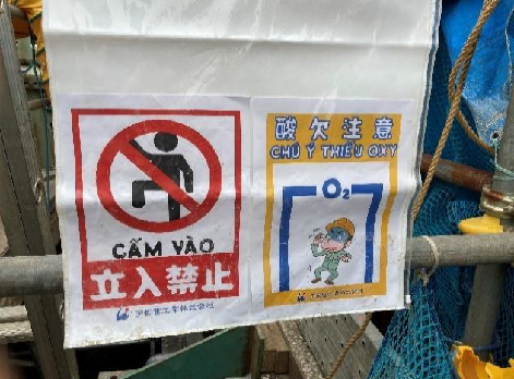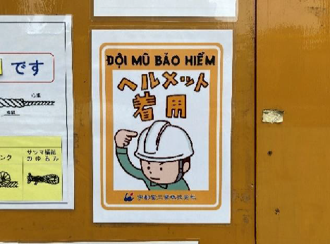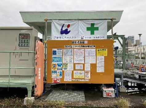| PRポイント | 施工場所の安全掲示板近傍の分かりやすい場所に救護用担架やAEDを常設し、誰でも使用できるようにした点については、現場事務所に保管される例は多いが、センター内の工事は事務所と現場が離れている場合が多く、実効性の向上に繋がった。 また、外国人作業員にも分かりやすく注意喚起するために、開口部の注意喚起や作業区画の標識に母国語表示とイラストを一緒に用いて表示した。 |