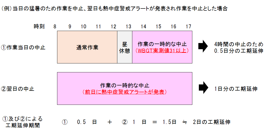 - 一時的な中止が設計で見込まれている「猛暑による割増し」の日数以上であれば工期延伸の対象となります。
