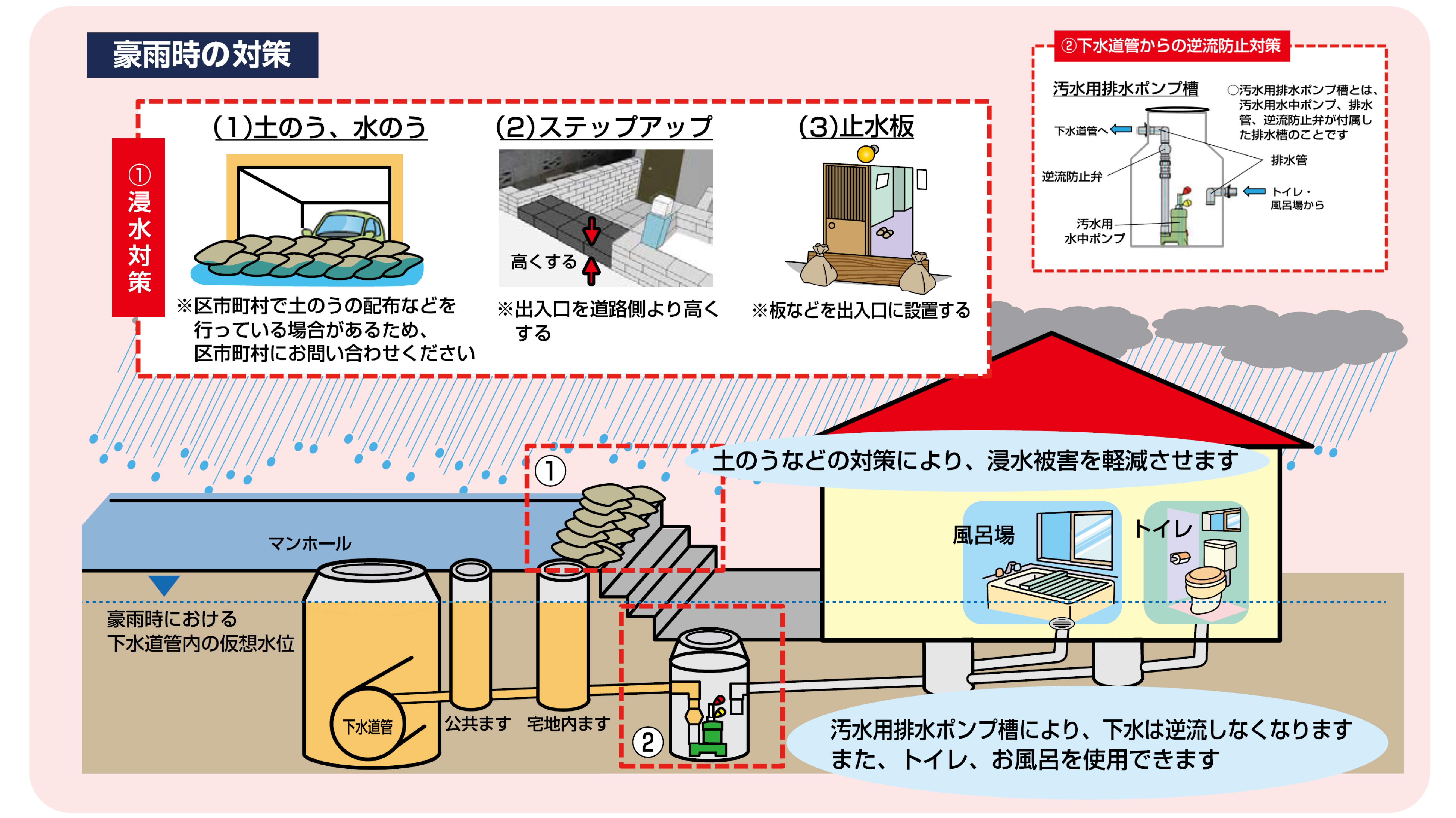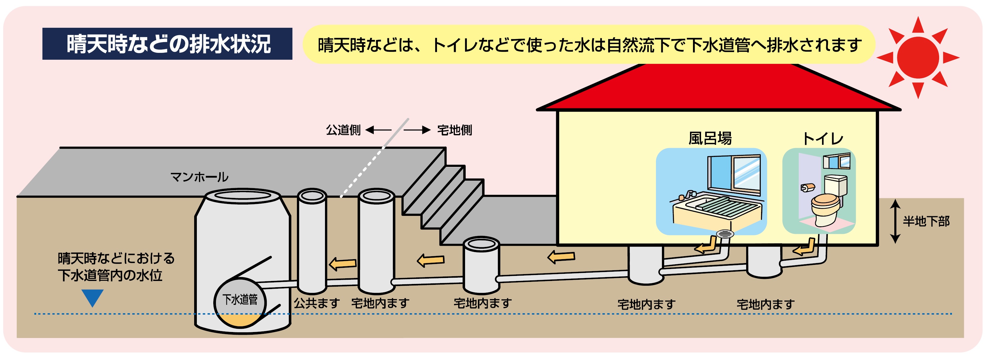 豪雨時には短時間で大量の雨水が下水道管に流れ込むと、下水道管内の水位が上昇し、下水が宅地内の排水管を通って逆流し、半地下部のトイレやお風呂場などの衛生器具から下水が噴出するおそれがあります。