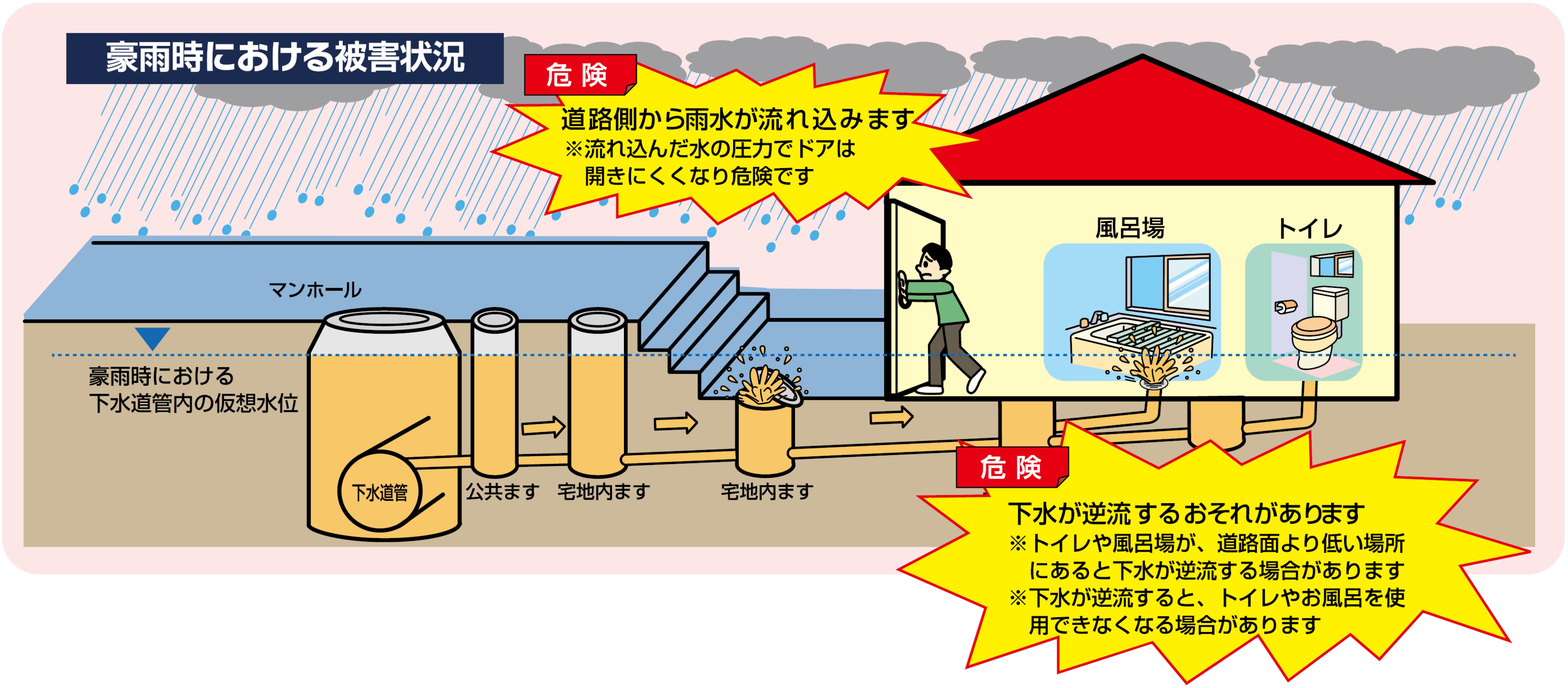 晴天時などでは、生活排水を問題なく排水できていても、豪雨時には下水道管からの逆流による浸水被害や道路側からの雨水の流れ込みによる浸水被害が発生するおそれがあります。