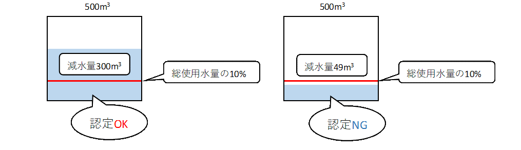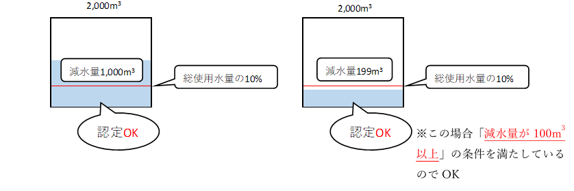 - 数値基準…1月当たりの減水量が1月当たりの総使用水量の10%以上を占めること(下図(1))。ただし、1月当たりの総使用水量が1,000m3を超えるものにあっては1月あたりの減水量が100m3以上となること(下図(2))。