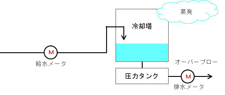- 冷却塔において、連続ブローを行わない場合や、自動ブロー装置付冷却塔の場合、給水メーターのみで減水量を算定することが可能です。