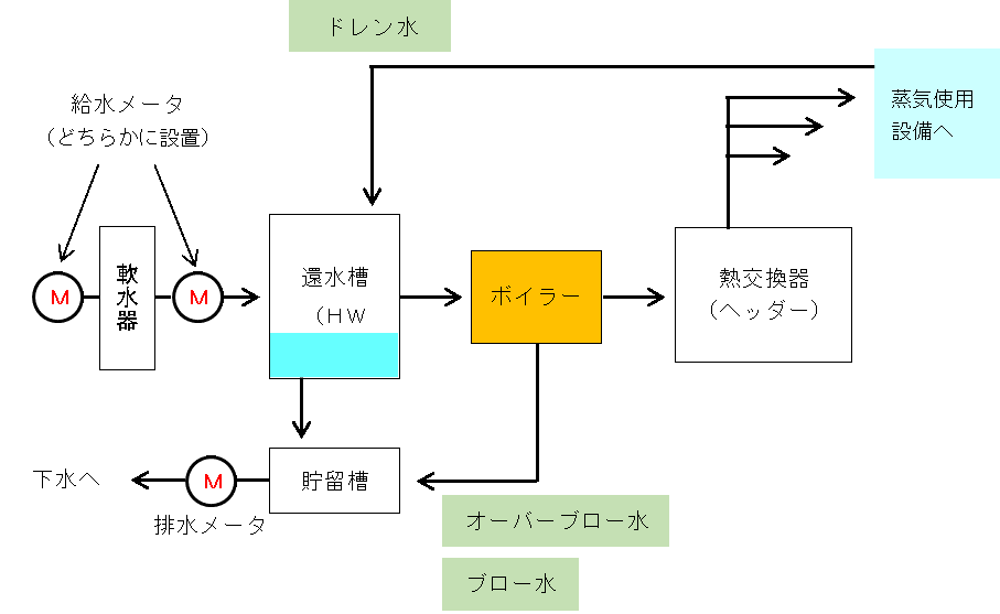 減水量は「給水量」-「排水量」の差引きで算定します。設置場所の例(ボイラーの場合)