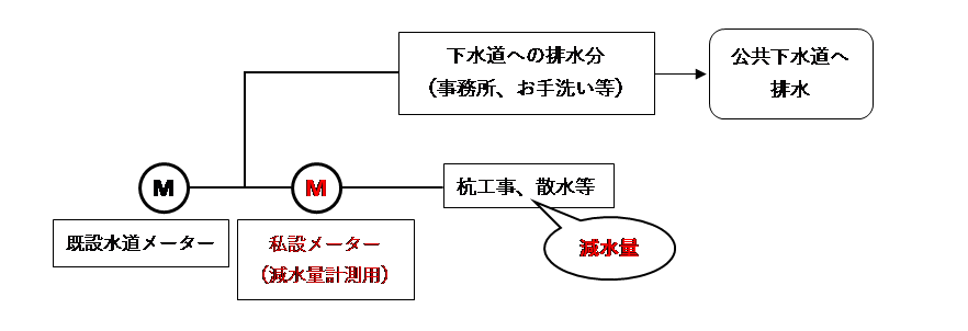 なお、減水量が適正に計測できる位置に量水器が設置されていない場合、減量認定ができませんので、量水器を設置する前に、申請窓口へご相談ください。設置場所の例(工事に係る減量の場合)