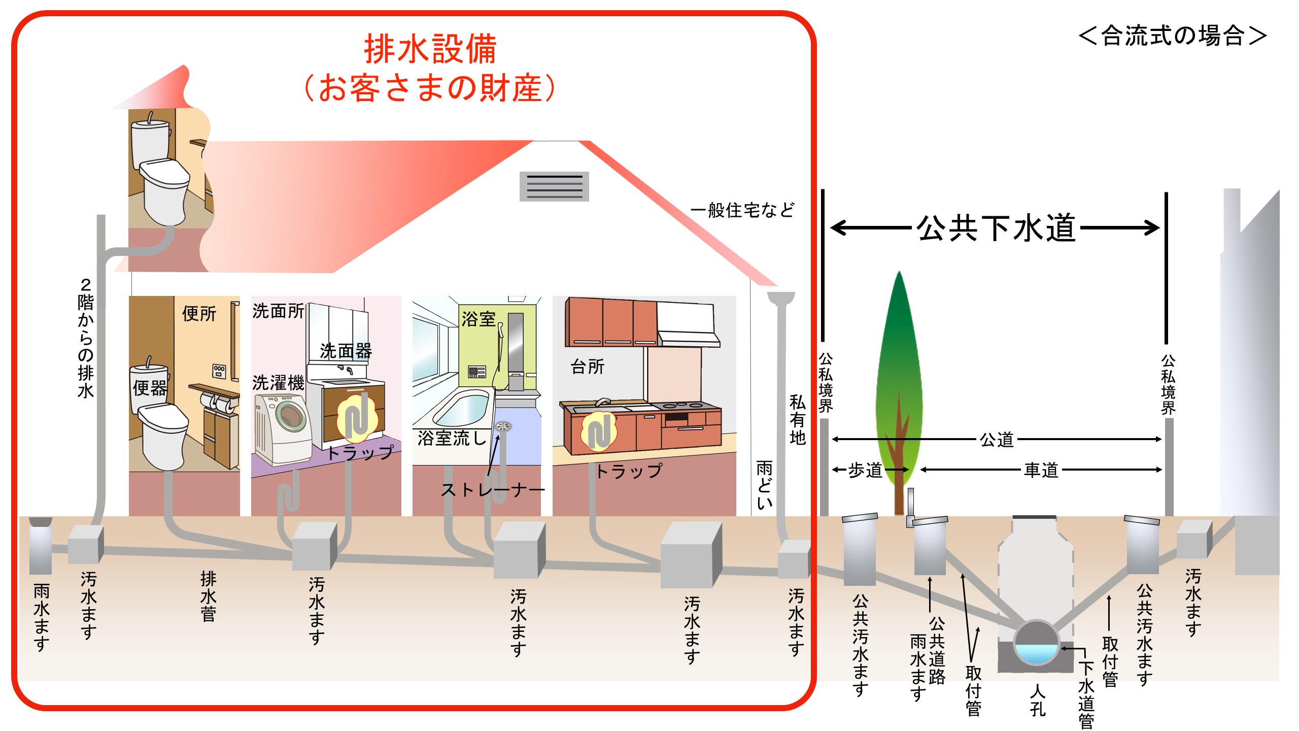 東京都下水道局が委託した受注者が戸別訪問し、お断りのうえ宅地内に入り、「ます」や「排水管」等の屋外部分(建物内には入りません)の排水設備の施工状況を調査することがあります。