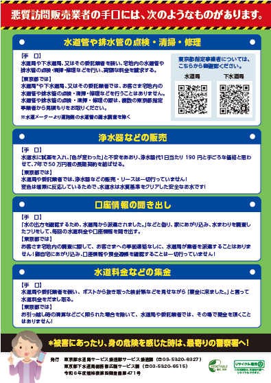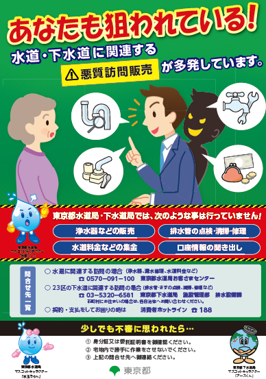 最近、言葉巧みに下水道局との関係をにおわせた業者が訪問し、排水設備の清掃や修理をすすめ、断ると威圧されたり、恐喝まがいの言葉で契約を強要される事案が発生しています。