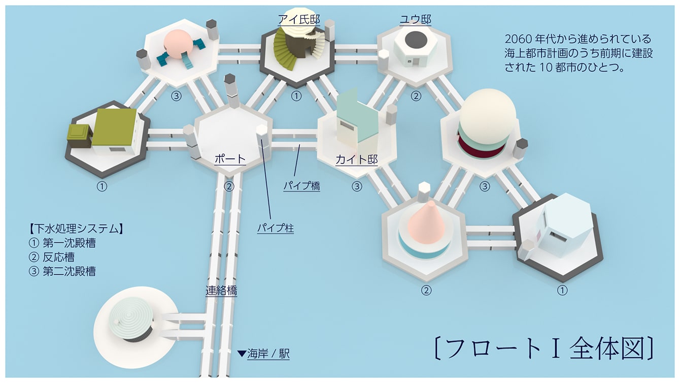海上都市のあり方をめぐるストーリーを、3Dアニメーションと文章で表現。