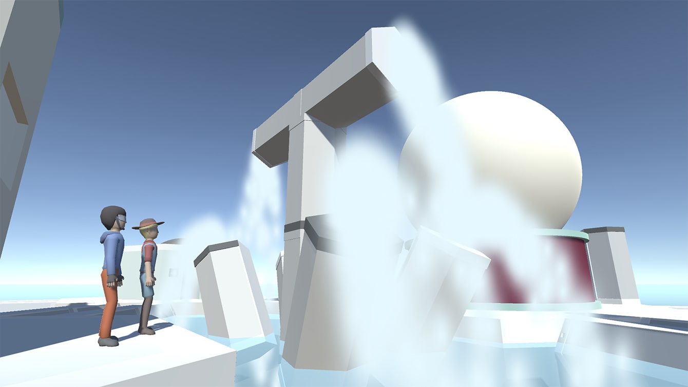 続いて2人は、それぞれの島に立つパイプ柱の根元にキューブを装着し、島の地面からパイプを切り離す。それを横向きに抱えて、先ほどパイプ橋があったあたりの海に放り出す。